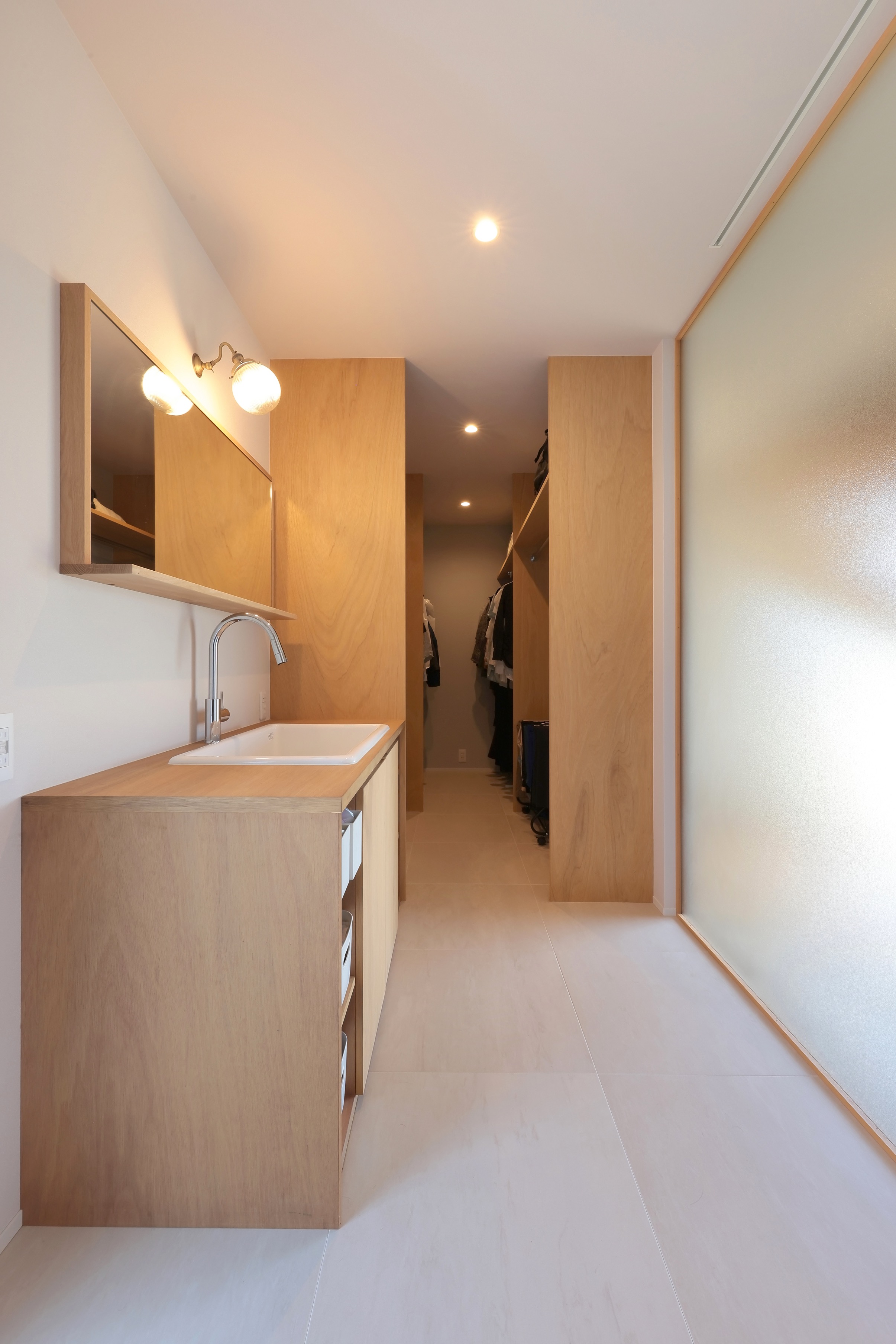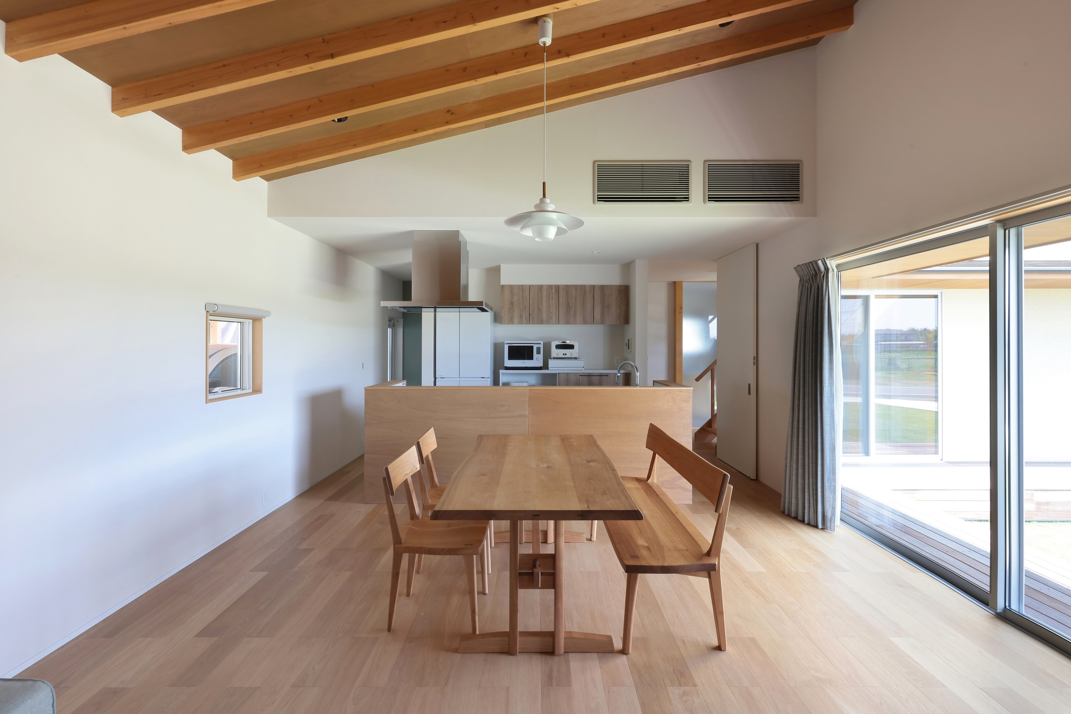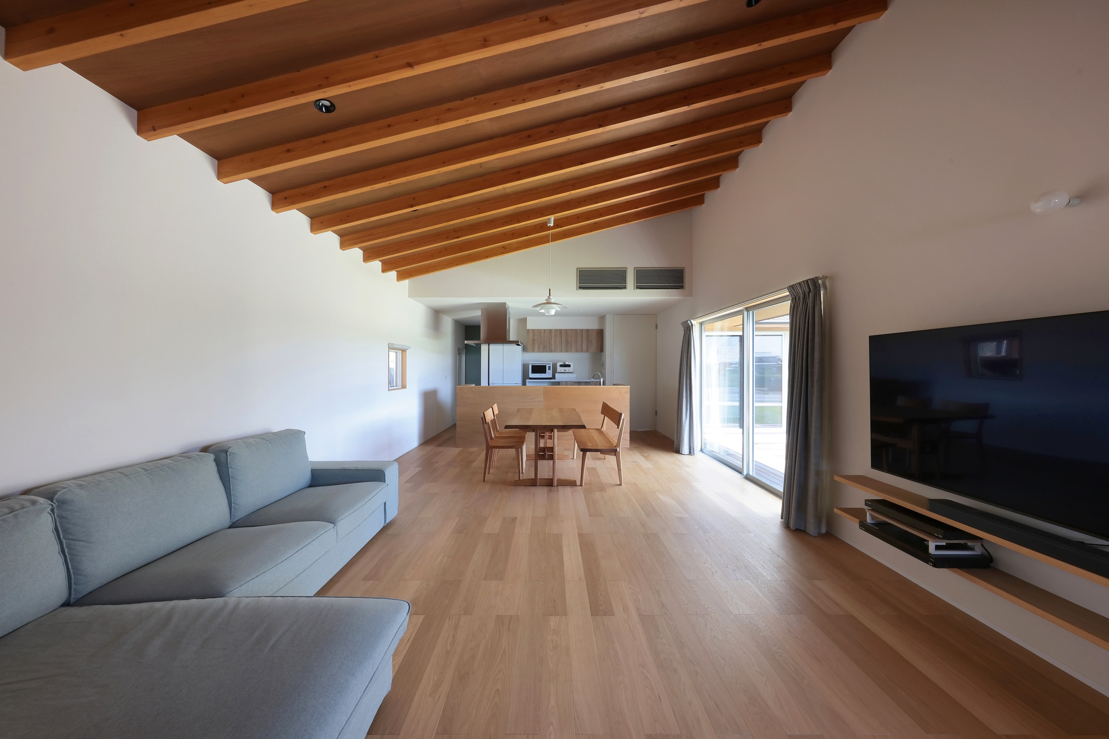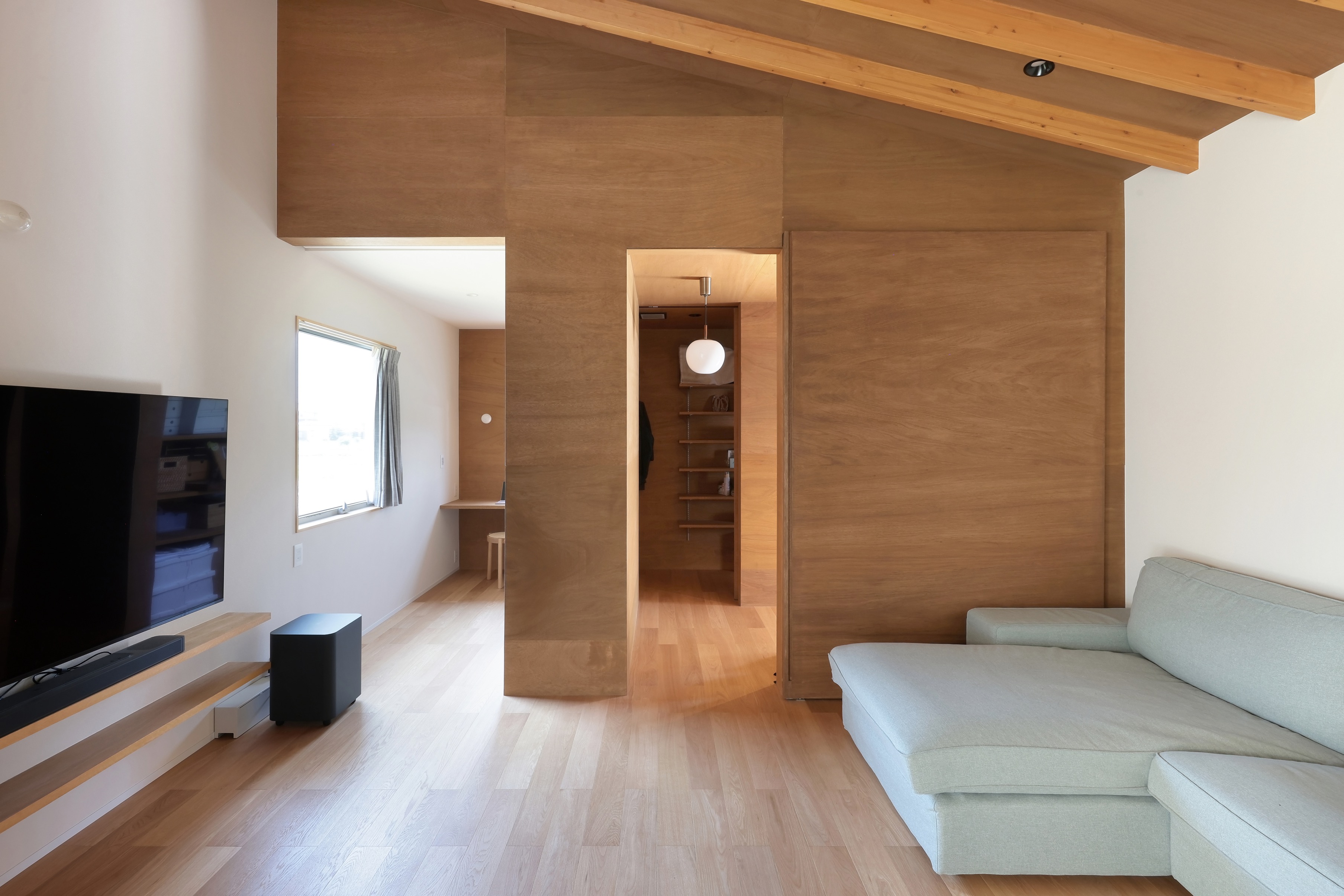 Additionally, in the living room and dining room where family and friends gather, lauan plywood is used for the ceiling and some walls so that the wood texture can be felt along with the greenery of the garden.
